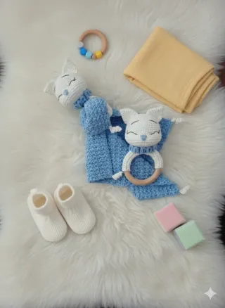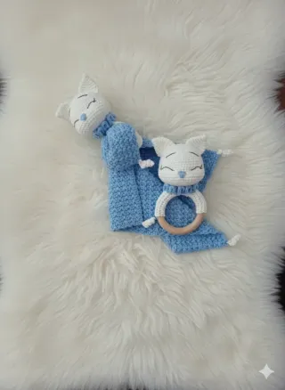 Conjunto de mantita de apego y sonajero con forma de gato, ambos hechos a crochet. - Diseño de gato en color blanco. - Detalles en color azul. - Sonajero con aro de madera.