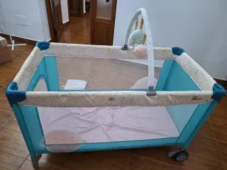 Cuna de viaje de la marca Jané, ideal para los más pequeños. Su diseño es moderno y funcional. Tiene muy poco uso. - Estructura resistente y segura. - Laterales de malla para ventilación. - Incluye arco de juegos con peluches. - Colchoneta con estampado de planetas. Colchón nuevo.