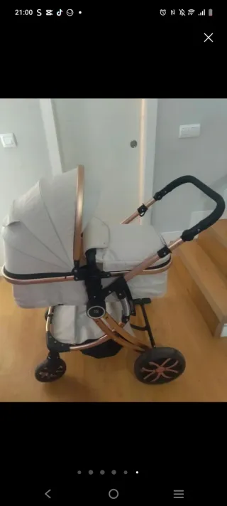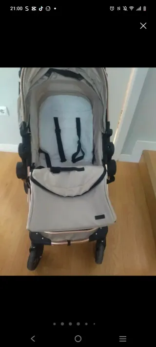 Carro de bebé en perfecto estado, ideal para paseos cómodos. - Capazo espacioso. - Silla de paseo. - Chasis ligero y resistente. - Ruedas todoterreno. - Manillar ajustable.