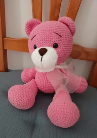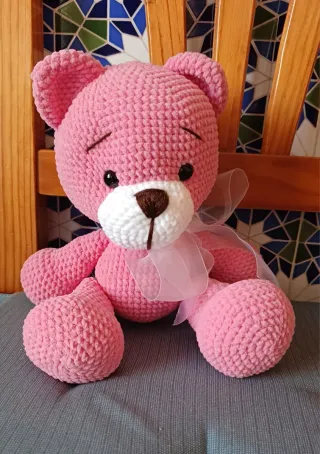Adorable osita tejida a mano con la técnica amigurumi. - Color rosa. - Detalle de lazo blanco.