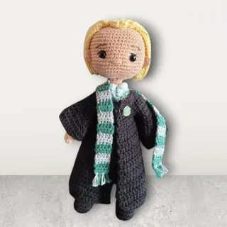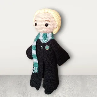 Figura amigurumi tejida a mano de Draco Malfoy, personaje de Harry Potter. - Hecho con hilo de algodón. - Incluye bufanda a rayas verdes y grises. - Detalle de insignia en la túnica.