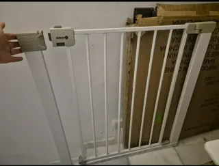 Barrera de seguridad metálica para escaleras o pasillos. Marca Safety 1st. - Color negro. - Incluye sistema de montaje. - Cierre de seguridad. -Roces de haber estado guardada.