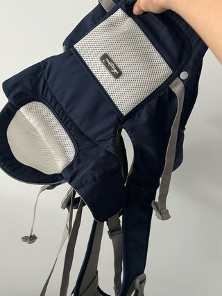 Canguro porta bebé en color azul marino con detalles en gris y beige. Diseñado para llevar al bebé de forma cómoda y segura. - Tejido de malla transpirable. - Múltiples ajustes para el porteador y el bebé. - Capucha incorporada. - Bolsillo frontal.