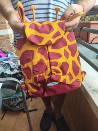 Mochila infantil Sammie by Samsonite con forma de jirafa. Es una mochila colorida y divertida, perfecta para niños. - Diseño original de jirafa en tonos rojizos y amarillos. - Asa superior para llevarla con la mano. - Bolsillos adicionales (no especificados).