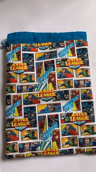 Práctico saco de merienda con estampado de Justice League y Defenders of Earth. Hecho a mano con mucho cariño - Diseño con viñetas de cómics. - Cierre de cordón azul. - Incluye un tirador de cordón azul. -Medidas:24x34cm #saco#superheroe#infantil