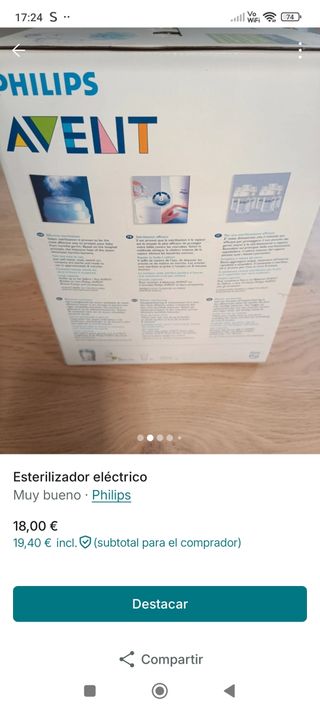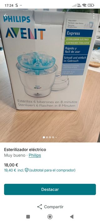 Esterilizador eléctrico Philips Avent en buen estado. - Capacidad para 6 biberones. - Esteriliza en 8 minutos. - Mantiene el contenido estéril hasta 6 horas.