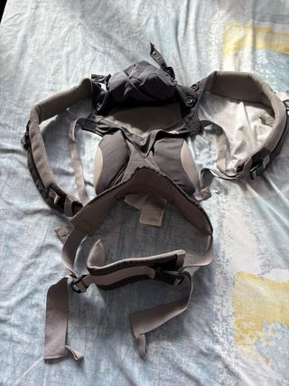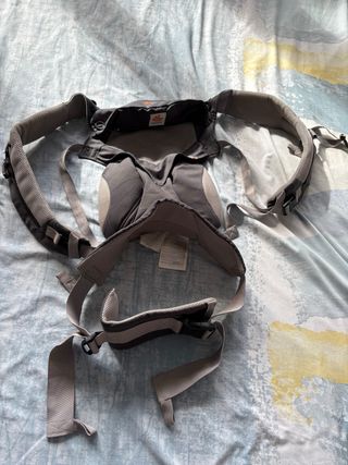 Mochila portabebés en color gris, ideal para llevar al bebé de forma cómoda y segura. - Diseño acolchado para mayor confort. - Tirantes ajustables. - Hebillas de seguridad.