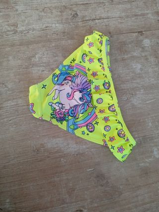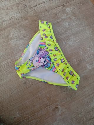 Braguita de bikini para niña con un divertido estampado de unicornios y donuts. El borde tiene un volante. - Estampado multicolor con unicornios y estrellas, en fosforito - Volante en el borde. Nunca usado, sin etiquetas