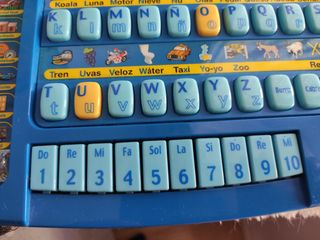 vendo “mi primer ordenador” es un maletin de peluche que asemeja ser un ordenador, en lo que seria el teclado viene cada letra guardada en su sobre y tienen velcro para pegarlas en lo que seria la pantalla