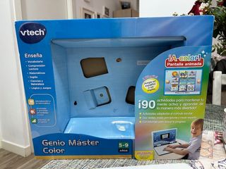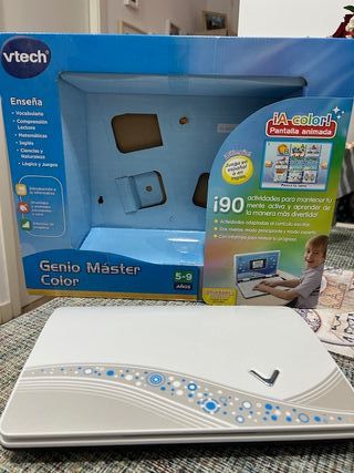 Ordenador portátil infantil VTech Genio Máster Color. - Pantalla animada a color. - Incluye 90 actividades educativas. - Diseñado para niños de 5 a 9 años. - Contenido en español e inglés. - Cubre áreas como vocabulario, matemáticas, ciencias y lógica.