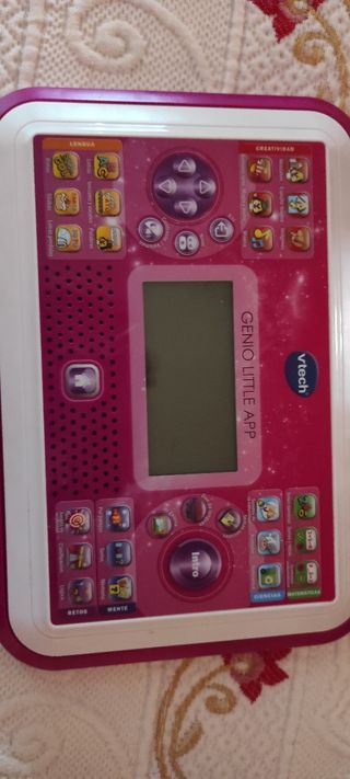 Juguete que simula un ordenador y una tablet, en muy buen estado, funciona perfectamente. Con sonidos en inglés y español. Para aprender números, letras, colores... Recomendado para niños de unos dos años. Funciona con pilas.