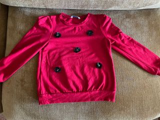 Sudadera de manga larga en color rojo, ideal para niñas. Presenta un diseño con flores decorativas en polipiel. Como nuevo, de la tienda a tu casa. Talla 7 , 122 cm - Marca: Mayoral - Color: Rojo - Detalle: Flores negras aplicadas