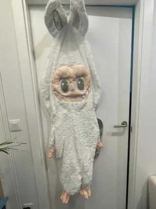 Disfraz de peluche blanco con alas plateadas, inspirado en Labubu. Se vende sin relleno. - Diseño de cuerpo entero. - Material suave y cómodo. - Detalles de alas y escamas.