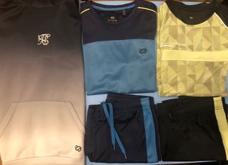 Lote deportivo de 5 prendas de la marca Silver para niño de 11 a 12 años, compuesto de: - Sudadera tejido deportivo con capucha y bolsillo. - Conjunto deportivo de camiseta y pantalón en tonos azul marino y azul. - Conjunto deportivo de camiseta y pantalón en tonos amarillo y negro.