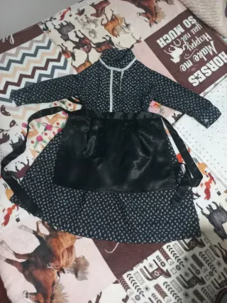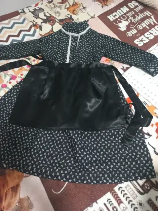 Conjunto de traje de casera para niña. Incluye traje y delantal. - Blusa y falda negra con estampado floral blanco. - Cuello blanco con encaje. - Delantal negro satinado.