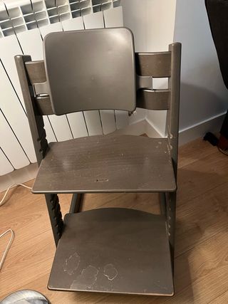 Trona evolutiva de la marca Stokke, diseñada para acompañar el crecimiento del niño. - Color gris oscuro. - Fabricada en madera. - Bandeja incluida.