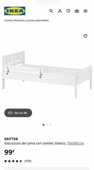 Estructura de cama infantil KRITTER en color blanco. Lo vendo por falta de espacio ( está empaquetado con lo cual la persona que lo quiere lo tiene que coger asi) - Incluye somier y el colchón siempre con funda y en perfecto estado - Medidas: 70x160 cm.