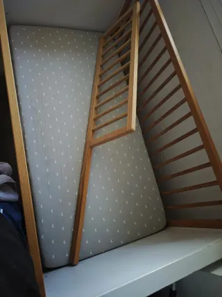 Cuna de madera con barrotes. - Estructura de madera. - Colchón incluido.