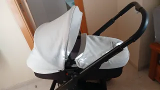 Cochecito de bebé en color gris claro, ideal para los primeros meses. - Capazo espacioso y cómodo. - Capota ajustable. - Chasis resistente y ligero. - Se entrega con plástico de lluvia *La venta de forma presencial por el tamaño*