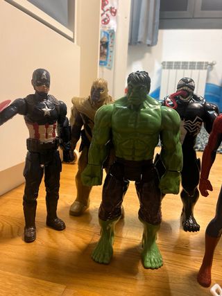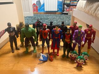Colección de figuras de superhéroes de Marvel y DC. - Figuras de Capitán América, Hulk, Venom, Spiderman. - Figuras de Superman, Batman, Robin, Joker, Flash, Iron Man. - Incluye figuras pequeñas del Joker.