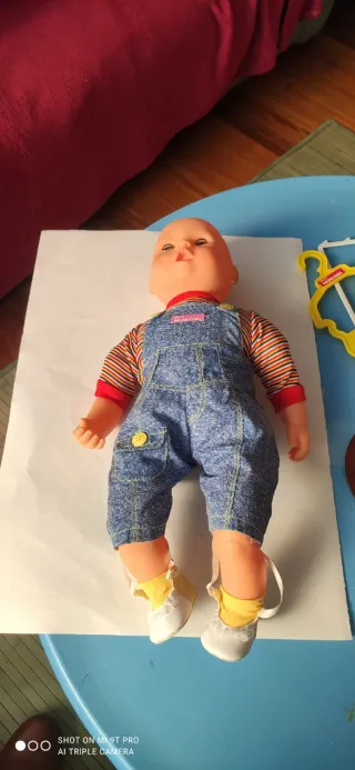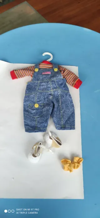 Conjunto de ropa para muñecos Nenuco o Baby Born, incluye un peto vaquero y una camiseta de rayas. También se incluyen zapatos y calcetines. - Peto vaquero con detalles. - Camiseta de manga larga a rayas. - Zapatos blancos. - Calcetines amarillos.