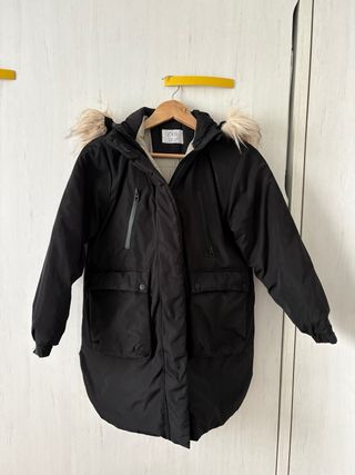 Plumífero de Zara para niña en talla 10 años. Ideal para el frío. - Color negro. - Capucha con pelo. - Bolsillos delanteros.