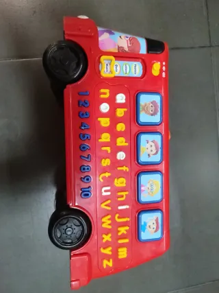 Autobús de juguete interactivo con diseño de autobús londinense. Ideal para el aprendizaje temprano. - Incluye botones de colores y formas. - Sonidos y melodías. - Ilustraciones de personajes en los laterales.