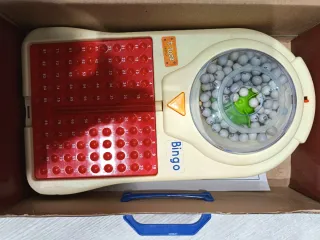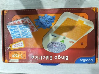 Juego de Bingo Eléctrico de Juguettos, modelo Senior. - Incluye tarjetas de bingo. - Contiene fichas azules. - Dispensador de bolas con bolas.