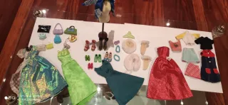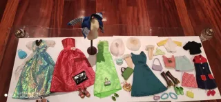 Lote de ropa y accesorios para muñecas Barbie, incluye un maniquí. - Vestido azul brillante con encaje. - Vestido rojo con lazo blanco. - Vestido verde con estampado. - Vestido azul marino con detalles rojos. - Chaqueta azul y blanca. - Blusas y faldas variadas. - Bolsos y zapatos. - Accesorios varios.