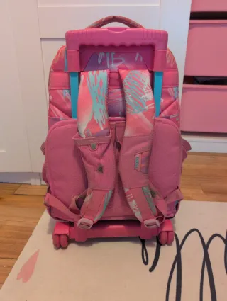 Mochila escolar con un divertido estampado tropical en tonos rosas y azules. Perfecta para llevar todo lo necesario al colegio. - Diseño con estampado tropical - Ruedas para facilitar el transporte. - Marca Totto.