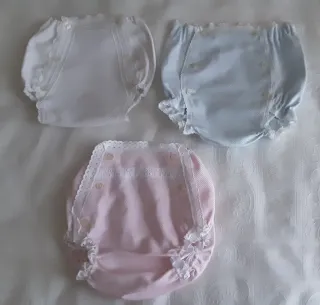 Lote de tres braguitas para bebé. Son grandes . Hay fotos con las medidas ENTREGO EN BILBAO , ZORROZA , LUTXANA , BARAKALDO , EL VALLE DE TRAPAGA , CRUCES PORTUGALETE , SANTURCE , ORTUELLA , MUSKIZ HAGO ENVÍOS MÁS ROPA DE BEBÉ EN MI PERFIL HAGO LOTES - Color blanco, azul claro y rosa. - Adornadas con puntilla y volantes. - Cierre de botones.