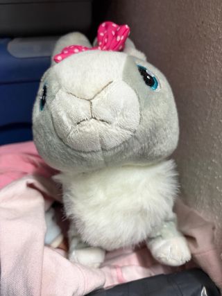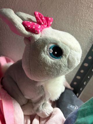 Adorable conejo de peluche con un lazo rosa de lunares. - Peluche suave y tierno. - Ojos grandes y expresivos. - Lazo decorativo en la cabeza.