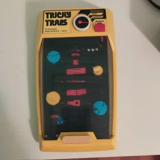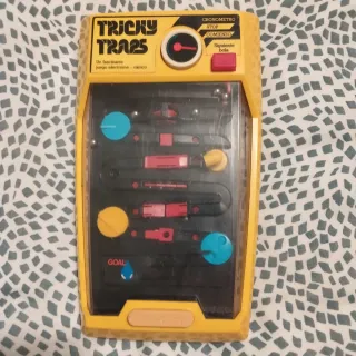 Juego electrónico Tricky Traps de Tomy, funciona perfectamente, juego electro mecánico de los años 80, contiene metraquilato transparente y tapara para las pilas RL14 - Diseño amarillo. - Mecanismo de laberinto con bolas. - Botón 'PUSH' para iniciar.
