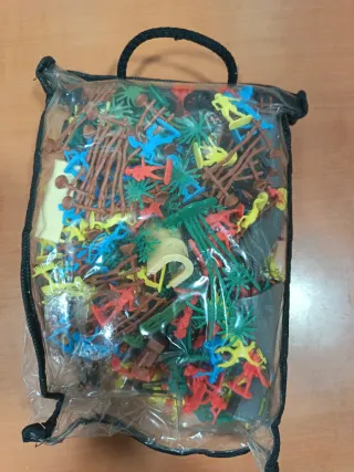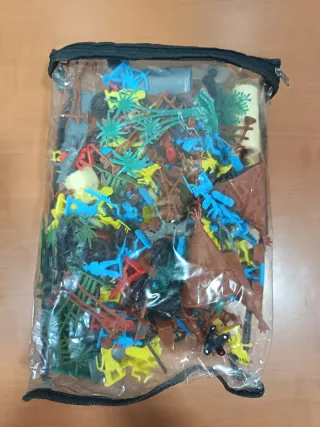 Set de figuras de vaqueros y soldados de plástico, ideal para coleccionistas o juegos. - Figuras de vaqueros y soldados. - Incluye accesorios como árboles y vallas. - Variedad de colores: azul, amarillo, rojo y verde.