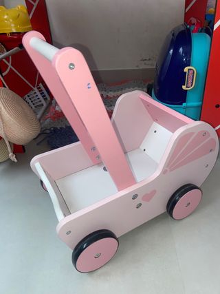 Bonito carrito de juguete para niñas, ideal para jugar a pasear muñecas. Su diseño es de color rosa con detalles de corazones y un capazo. - Material: Madera. - Color: Rosa. - Diseño: Carrito de bebé. - Detalles: Corazones y capazo. Aprox. 40 x 26,4 x 42,6 cm.