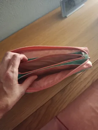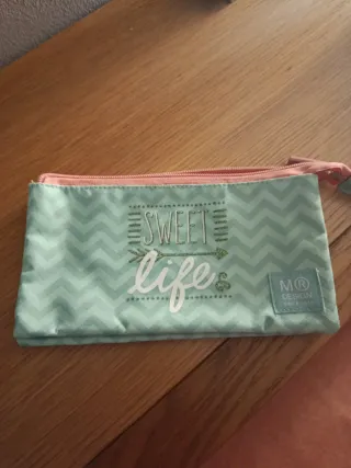 Estuche con un diseño bonito en color verde menta y detalles en rosa. - Tres compartimentos con cremallera. - Estampado Sweet Life con flecha. - Pequeña etiqueta MR DESIGN en la esquina.