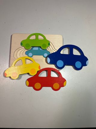 Puzzle de madera con piezas de coches de colores. - Incluye 5 coches de madera. - Colores: rojo, amarillo, azul, verde y turquesa. - Base de madera con ranuras para encajar las piezas.