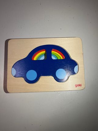 Juego de encajables de madera con forma de coches de la marca Goki. - Incluye un puzzle de madera con varias capas de coches. - Los coches sueltos son de colores: verde, azul claro, azul oscuro, amarillo y rojo. - Los coches sueltos tienen ruedas pintadas.