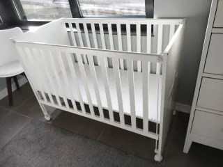 Cuna Colecho para bebé con colchón. - Estructura de madera lacada en blanco, medidas 120x60 - Laterales con barrotes. - Ruedas para facilitar el movimiento. - Colchón Ecus con funda.