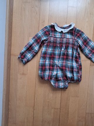 Pelele de la marca Doña Carmen para bebé. - Talla 18 meses. - Diseño de cuadros escoceses en tonos rojos, azules y blancos. - Cuello blanco con volante. - Mangas largas. - Cuerpo fruncido en la parte superior.