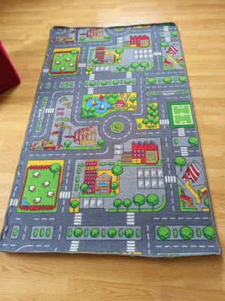 Alfombra de juego infantil con diseño de ciudad y carretera. Medidas 160 x 98 cm. - Ideal para crear un espacio de diversión. - Motivos de edificios, árboles y ovejas. - Colores vivos y diseño detallado.