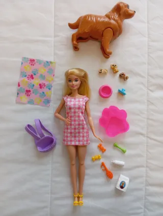 Set completo de Barbie con perritos recién nacidos y accesorios. Todo en perfecto estado.