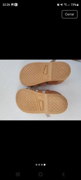 Sandalias de piel color camel, fabricadas en España. Tienen un diseño con tiras adornadas con pedrería. - Cierre de hebilla. - Suela interior de cuero. - Fabricadas en España.