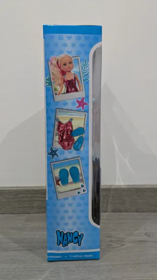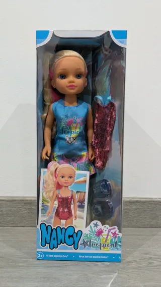 Muñeca Nancy con temática tropical, lista para la diversión. - Incluye un bañador de lentejuelas. - Viene con gafas de sol. - Incluye un vestido de verano.