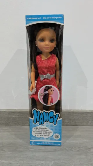 Muñeca Nancy con temática de Un día con amigas. - Incluye un cepillo para el pelo. - Vestido rojo con lunares blancos y cinturón plateado.