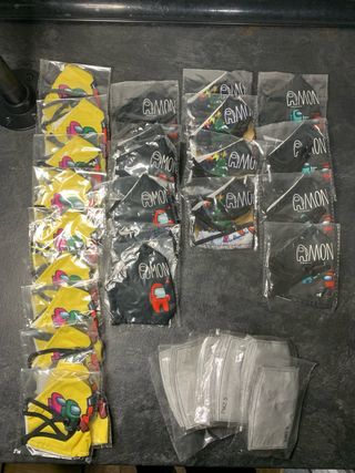 Lote de 22 mascarillas infantiles con diseños variados, ideales para niños. Se incluyen algunos filtros. - Diseños de Among Us. - Colores: amarillo, negro y con motivos navideños. - Incluye filtros PM2.5.