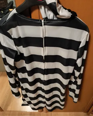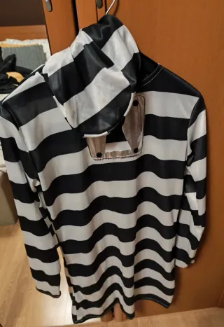 Disfraz de preso para niños, ideal para fiestas o carnaval. - Diseño a rayas blancas y negras. - Incluye capucha. - Detalle plateado en la espalda.