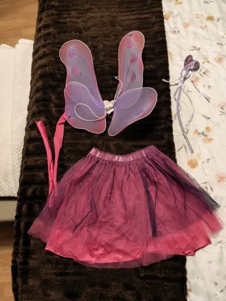 Conjunto de disfraz de hada para niña, ideal para fiestas o juegos. - Incluye alas y falda. - Talla 4-6 años. - Alas con detalles morados y rosas. - Falda de tul en tonos morados y rosas - Barita mágica con corazón. - Lazos para pelo