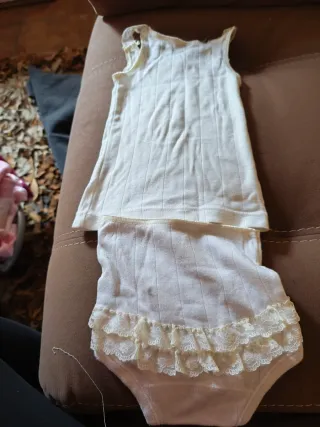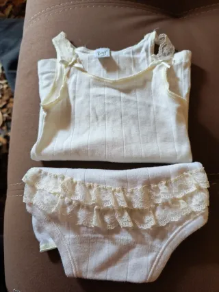 Conjunto de camiseta y braguita para niña. - Talla 6. - Color crema. - Detalle de encaje y lazos en la camiseta. - Braguita con volantes de encaje.