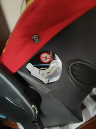 Silla de coche para niños con diseño moderno y detalles en negro y rojo. - Logo ms en la parte superior. - Detalle EVOL en el lateral. - Base con textura de puntos. - Inscripción SMAGIC-FIX en la base.